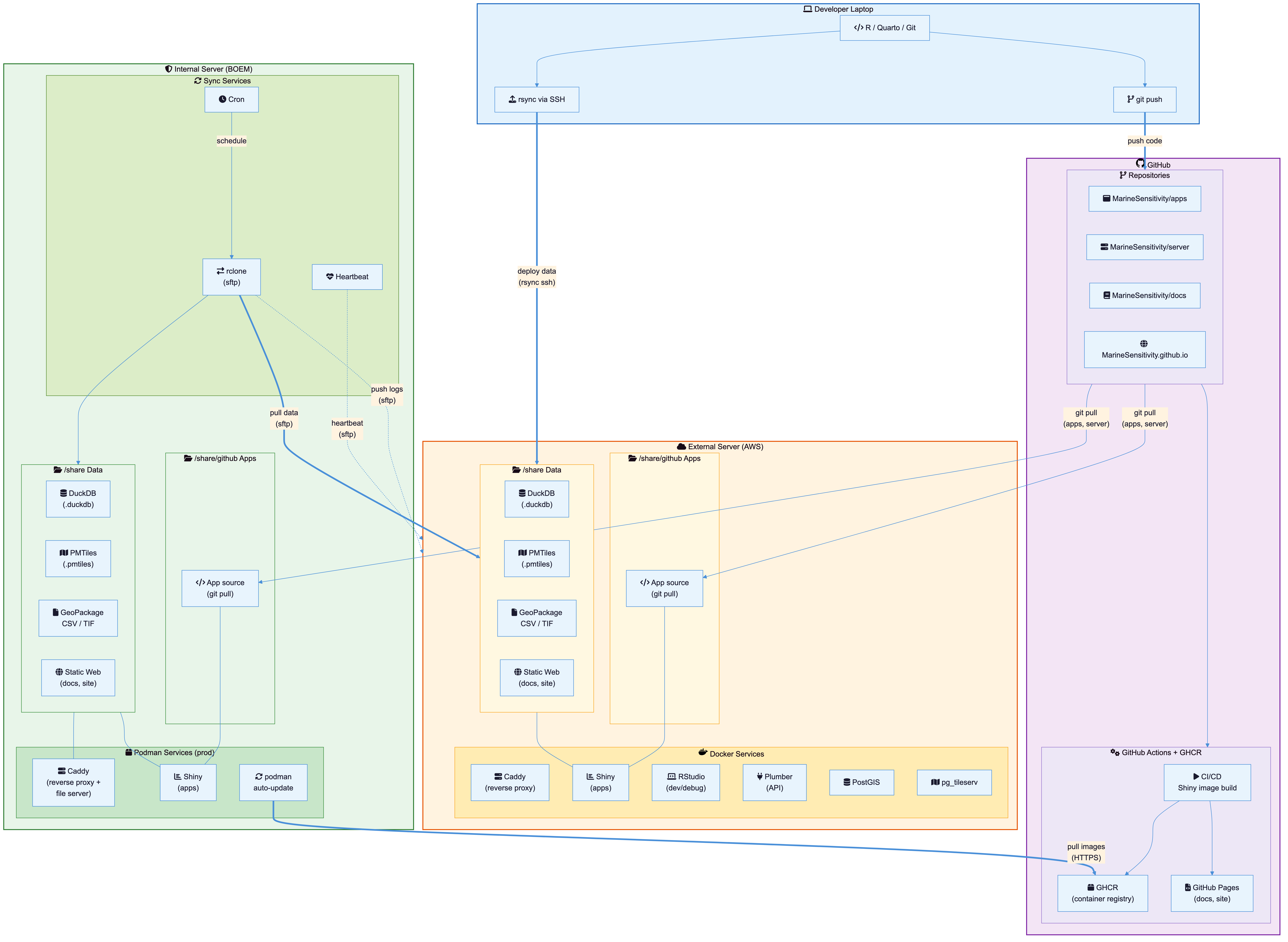 deploy_to_server.sh, which usesrsyncover SSH to push derived data (DuckDB, GeoPackage, CSV, TIF) from the developer laptop to the external server’s/share/datadirectory, then restarts the Shiny container. - App source code — the developer pushes to GitHub, then SSHs into the external server to run