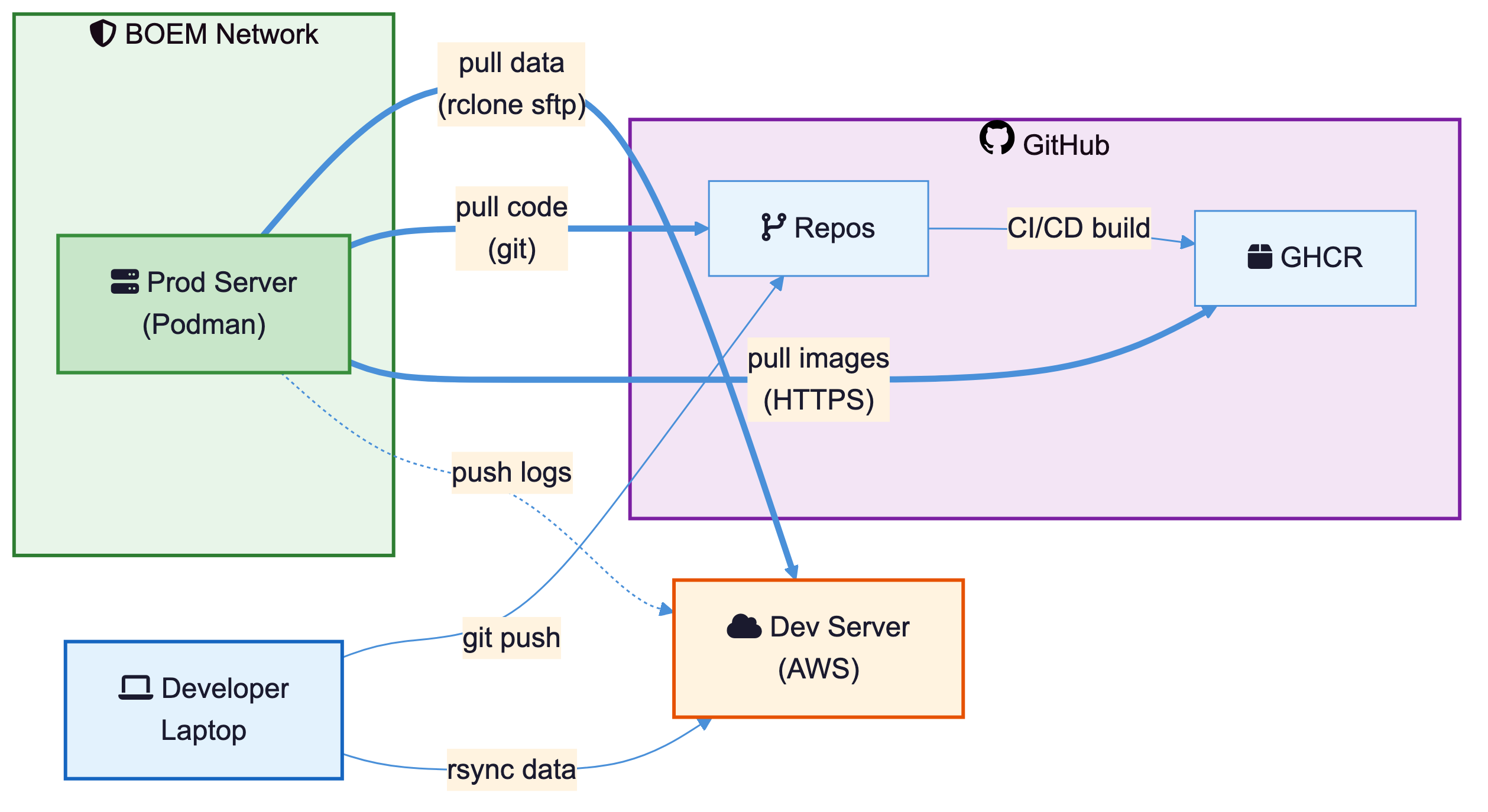 To bridge this gap, the internal production server must initiate all synchronization — pulling software updates (container images), data files, and static web content from the external development server, and pushing log files back for remote debugging. This document describes the architecture, synchronization strategy, implementation scripts, monitoring approach, and government compliance considerations for this arrangement.