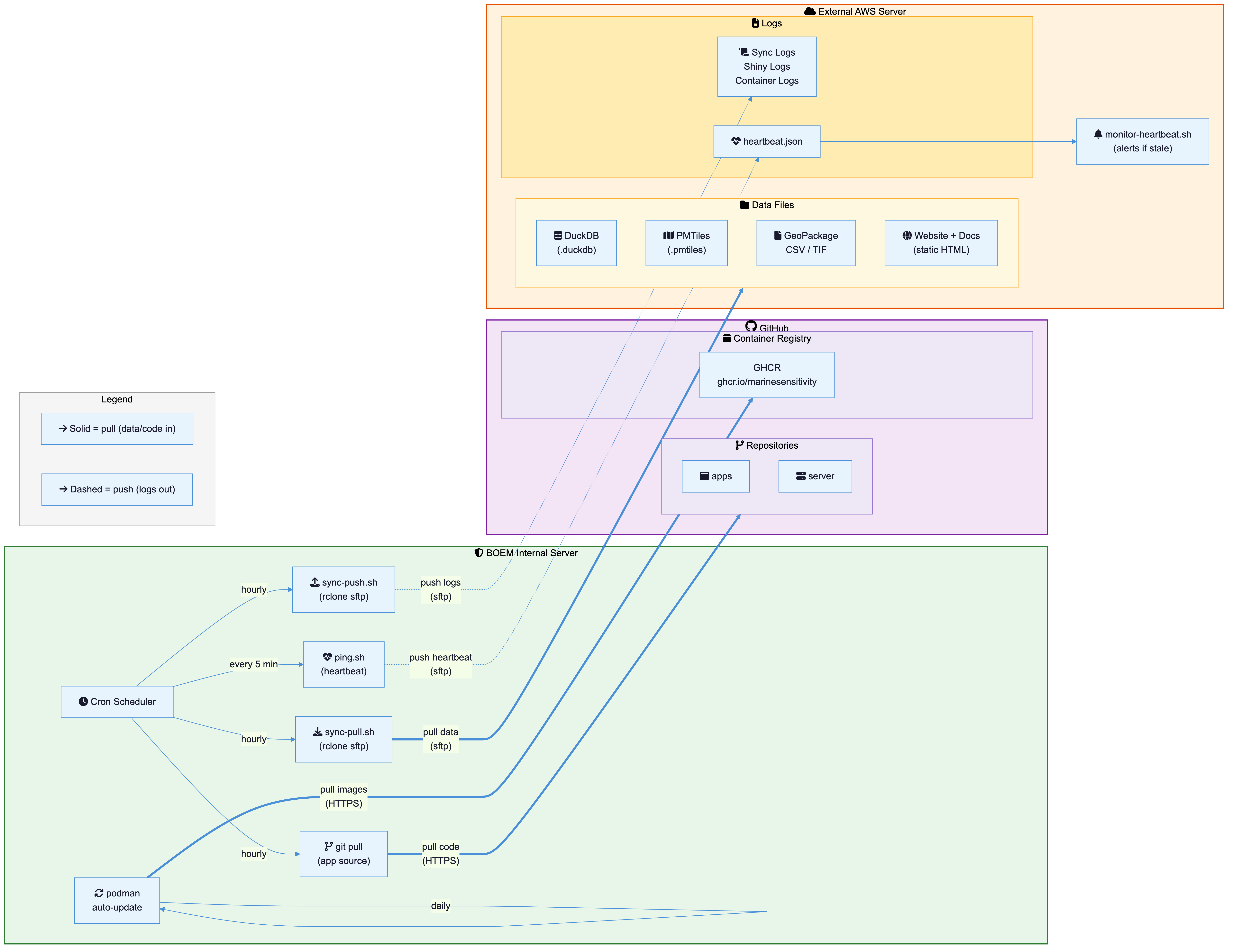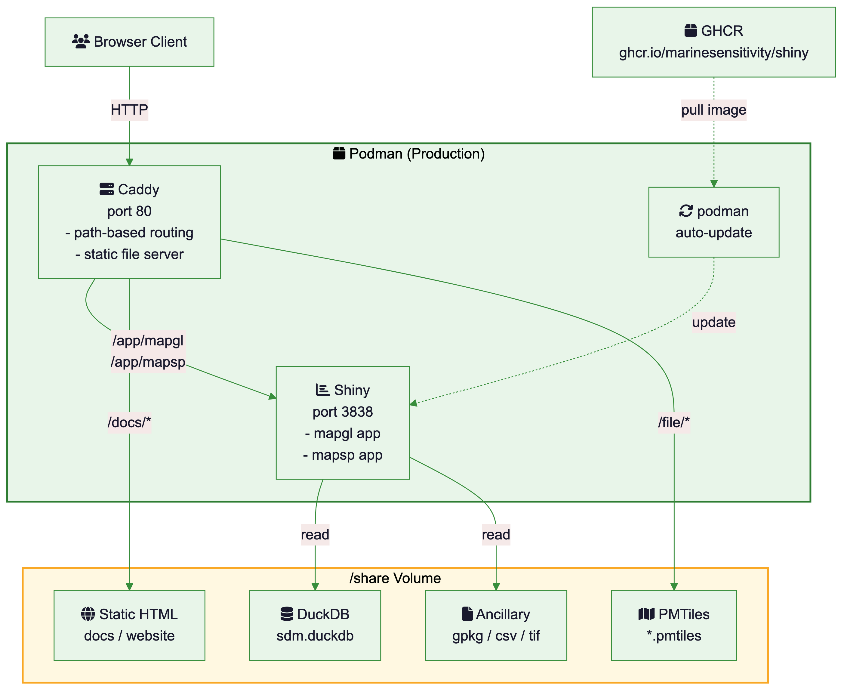 git pullin/share/github/MarineSensitivity/apps. The Shiny Server watches the app directories and picks up changes automatically.