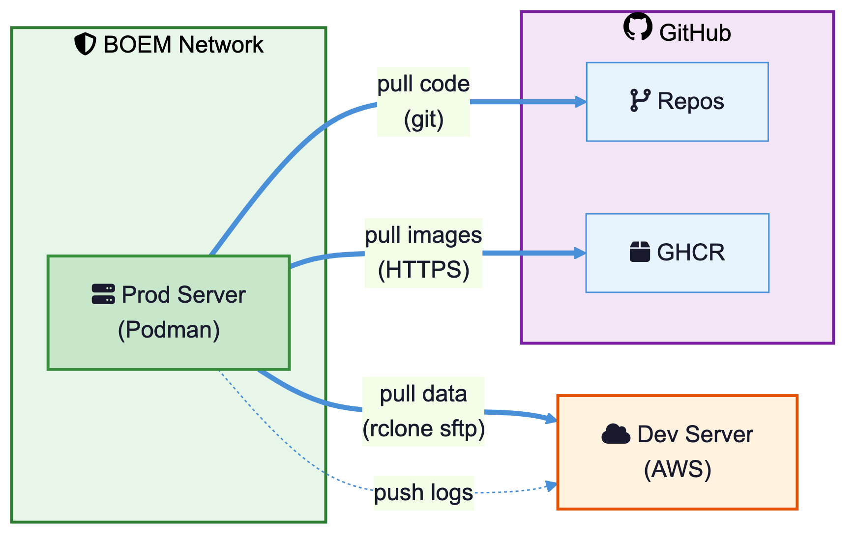 All synchronization is initiated by the internal server — it pulls updates from the external server and pushes logs back. No inbound connections to the BOEM network are required.