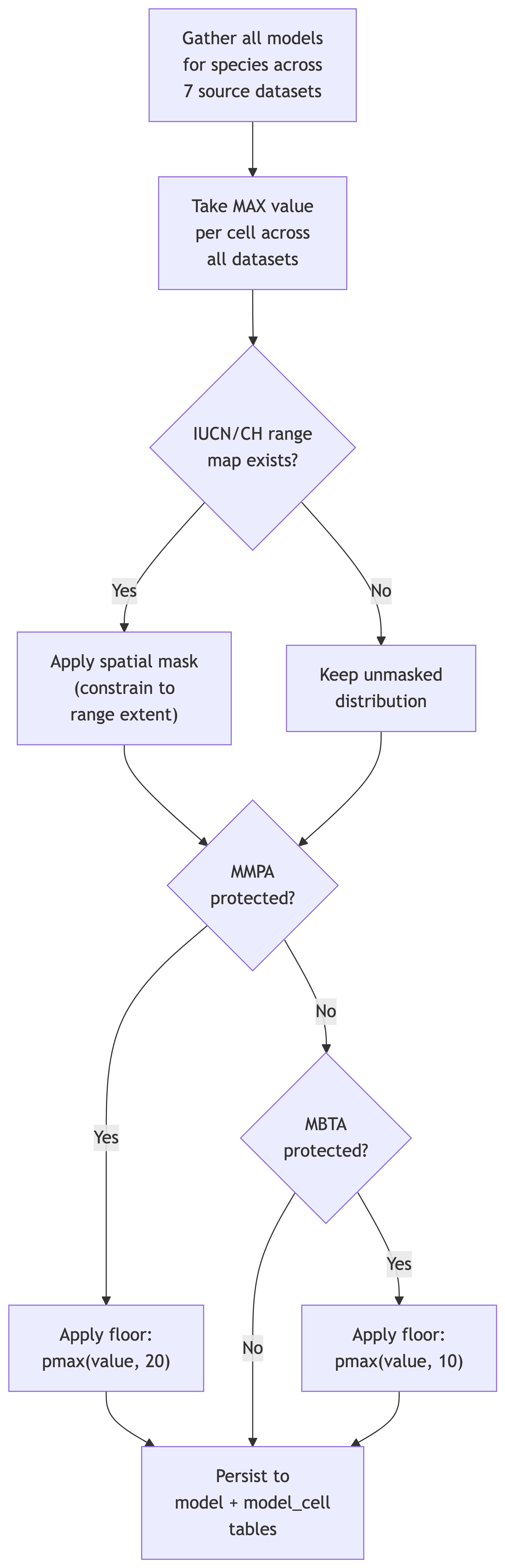 Each species may have distribution data in multiple source datasets (see Chapter 3). The model merging pipeline combines these into a single merged model per species, applying spatial masking and minimum floor values to reflect regulatory protections.