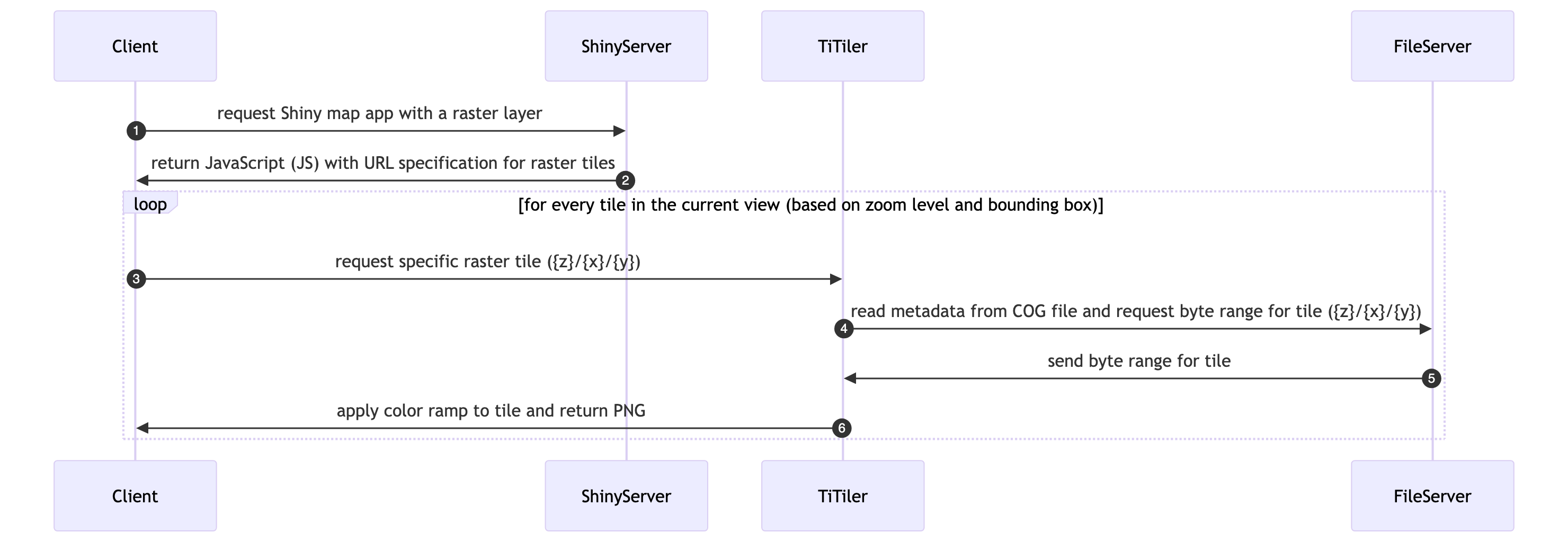 Historically, to read a raster, such as a GeoTIFF, from the web, the client software would have to read the entire file before rendering. Cloud Optimized GeoTIFFs (COGs) take advantage of HTTP GET range requests to read only the part of the file needed for rendering. So a COG stores quadtree simplifications of the original raster at multiple zoom levels and metadata for accessing their byte ranges in the file in the metadata header. This allows the client software to request only the parts of the file needed for rendering, which can greatly reduce the amount of data transferred and speed up rendering. This is for accessing the raw data in pixel values, e.g., for a raster of species distribution then the abundance of a species in each cell. We would want to also apply a color ramp to visualize the data. The open-source (TiTiler software is a lightweight web service that serves up these color ramped tiles on the fly. So COGs can be stored on a simple file server (like Amazon S3 or Azure Blob Storage) and served up as interactive web maps with TiTiler as an intermediary between the COG files and the client accessing the interactive Shiny mapping app (Figure 9.1).