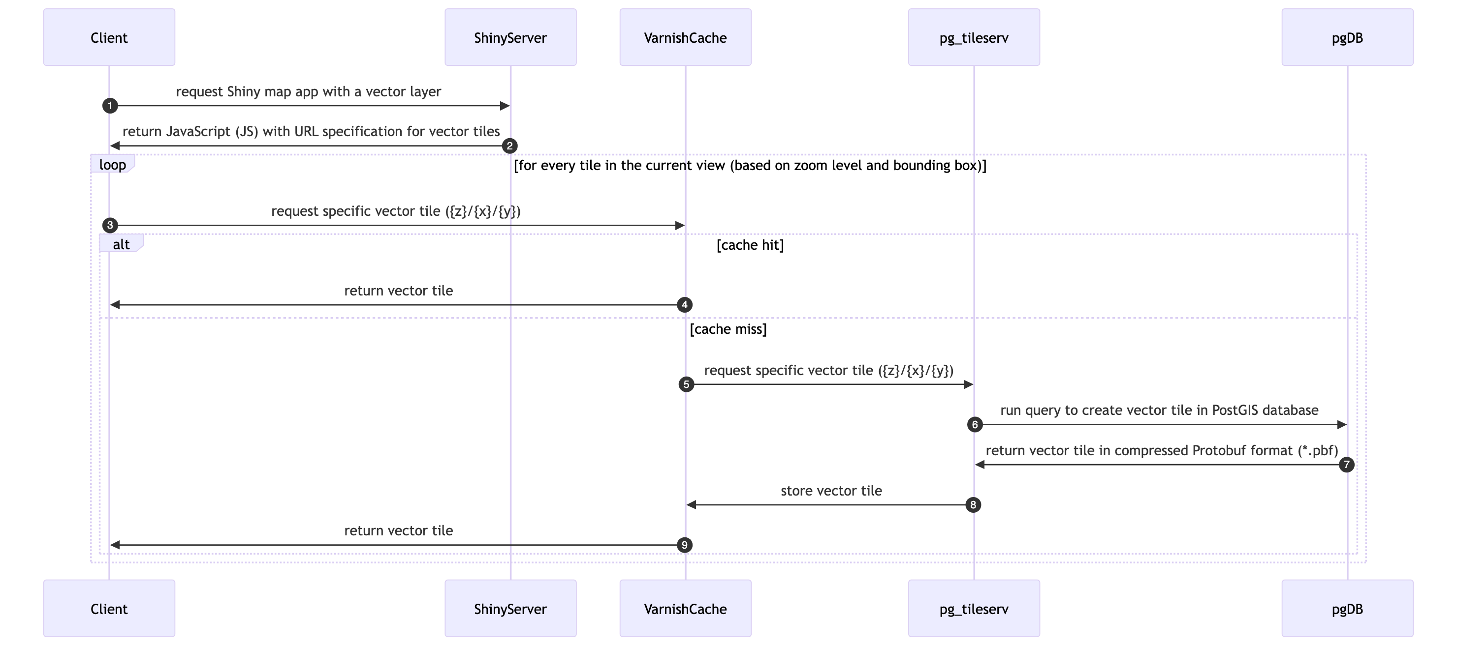 Although “cloud native” vector formats exist for simple file storage (see Cloud-Optimized Geospatial Formats Guide), none of these allow for flexible filtering and manipulation. Instead, we use PostgreSQL with the spatial extension (PostGIS) to store the vector data and serve it as Mapbox Vector Tiles (MVTs) using the pg_tileserv web service written in the language Go, which is very fast. This means that we don’t have to pre-render the MVTs (such as you might do with tippecanoe), but can instead serve the raw vector data directly from the database and let pg_tileserv handle the rendering on the fly. Filters (in the form of CQL) can be applied to the request. Symbology is rendered client-side via JavaScript, which allows for interactive hover and click events on vector objects (e.g., BOEM aliquot). Some speed-up is enabled by implementing a Varnish cache service in between. We can even write our own database functions for customized rendering, such as H3 hexagonal summaries. This allows us to serve vector data as web maps with minimal configuration and setup, and it provides a fast and efficient way to display large vector datasets in an interactive web application (Figure 9.2).