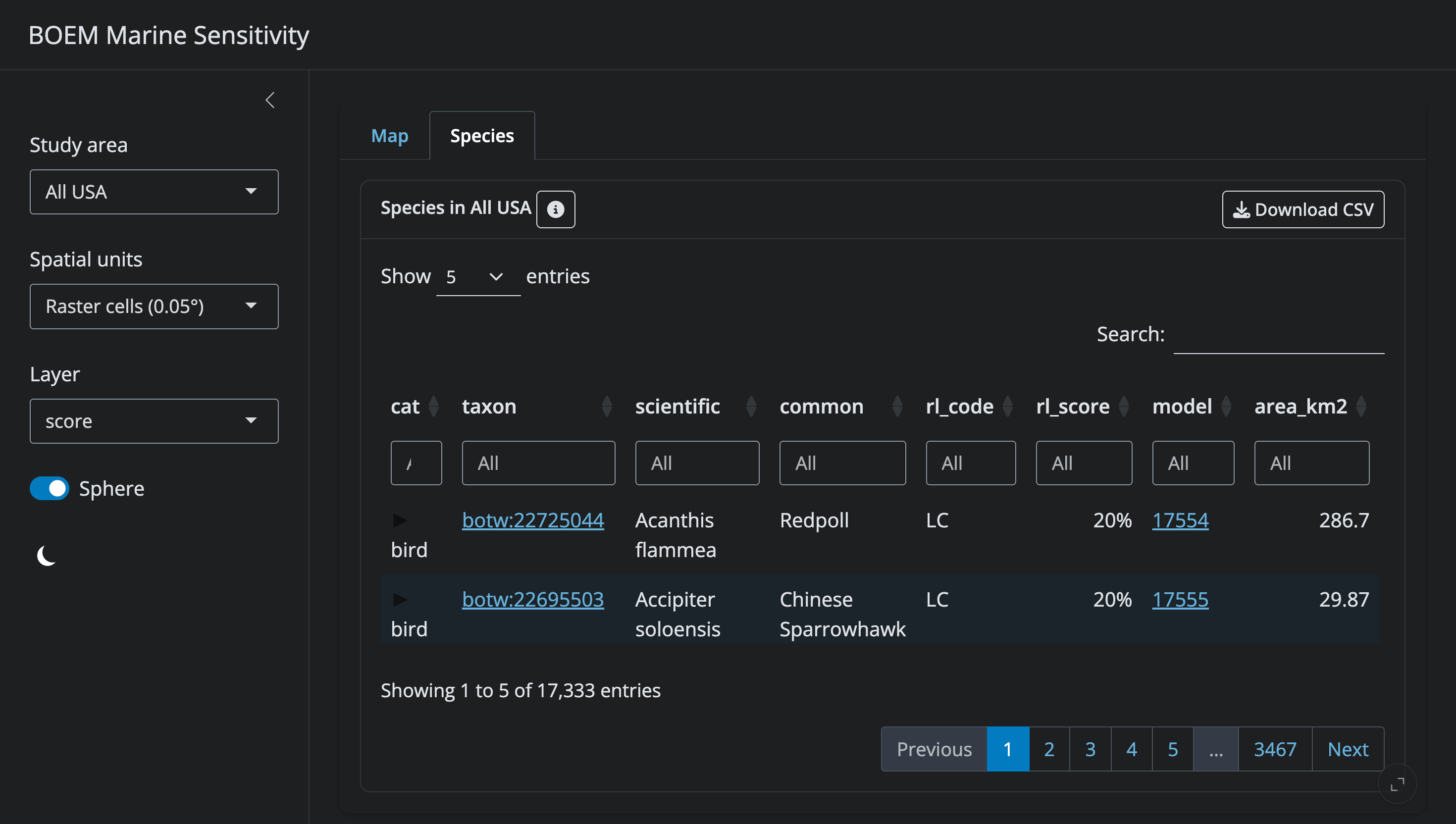 The main app mapgl app (Figure 10; Figure 11; Figure 12) shows the overall scores and any underlying components by 0.05° raster cell or Planning Area, all masked by the chosen Study area. The model link in the Species table (Figure 12) links to the species distribution app mapsp (Figure 13), which shows the distribution of the species, in this case for the blue whale, which is globally distributed.