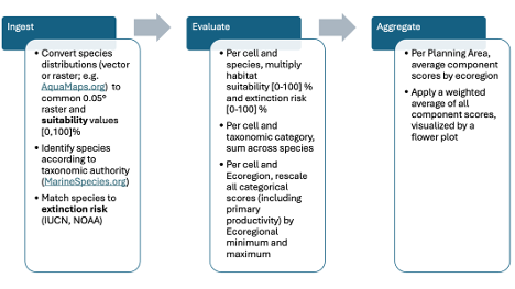 If a cell has many species that are both likely to be present and at high risk of extinction, it gets a higher sensitivity score. This helps us find places where rare or threatened species are concentrated. Ecoregional rescaling makes it easy to compare areas within the same region and planning area aggregation gives us an overall sensitivity score for each planning area, taking into account both the sensitivity of each part and how big each part is.