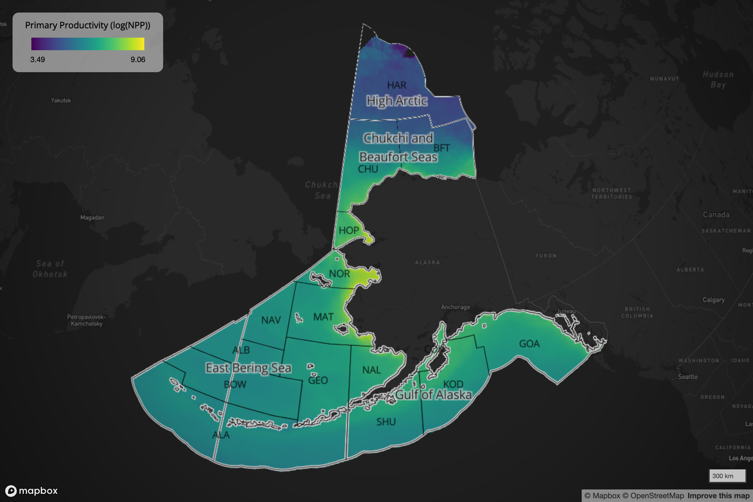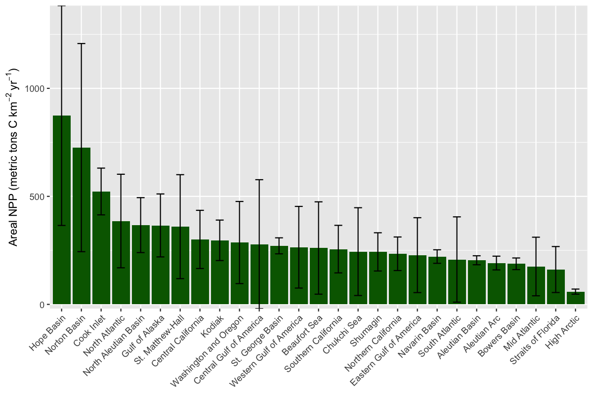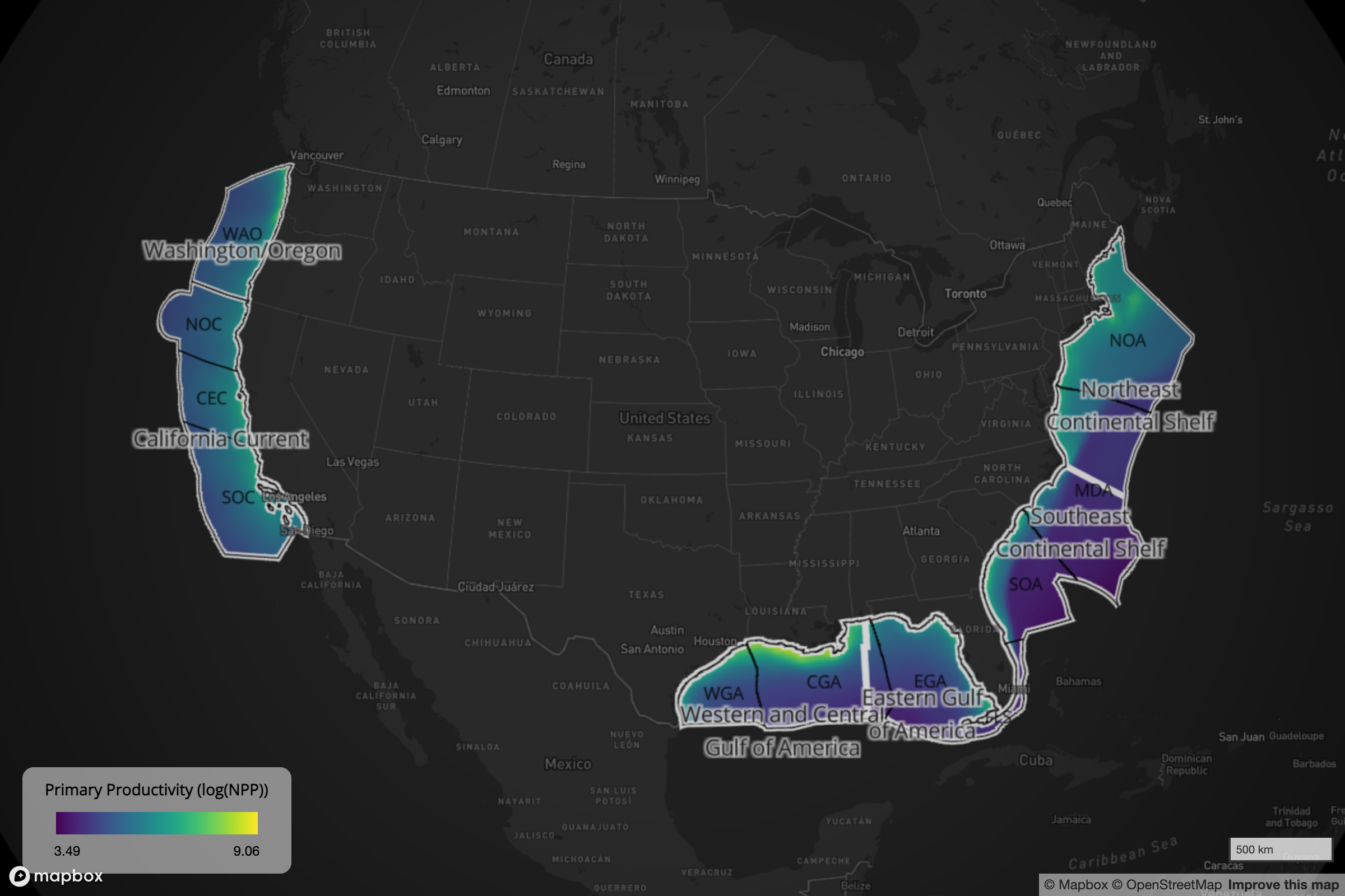 Net Primary Productivity (NPP) was calculated using the Vertically Generalized Production Model (VGPM) (Behrenfeld and Falkowski 1997) with VIIRS satellite data (R2022 version) for the most recently completed decade (2014 to 2023). The VGPM is a chlorophyll-based model that estimates net primary production using a temperature-dependent description of chlorophyll-specific photosynthetic efficiency. Monthly NPP data at 0.083° resolution (2160×4320 global grid) were downloaded from Oregon State University’s Ocean Productivity website as HDF files, processed to extract NPP values (units: mg C m-2 day-1), and averaged annually for each year. The 10-year mean and standard deviation were then calculated across all years. The high-resolution productivity raster was downsampled to match the 0.05° species distribution grid using bilinear interpolation and masked to the study area. For Planning Area summaries, zonal statistics were computed using area-weighted means, and values were converted to metric tons C km-2 yr-1 for easier interpretation.
