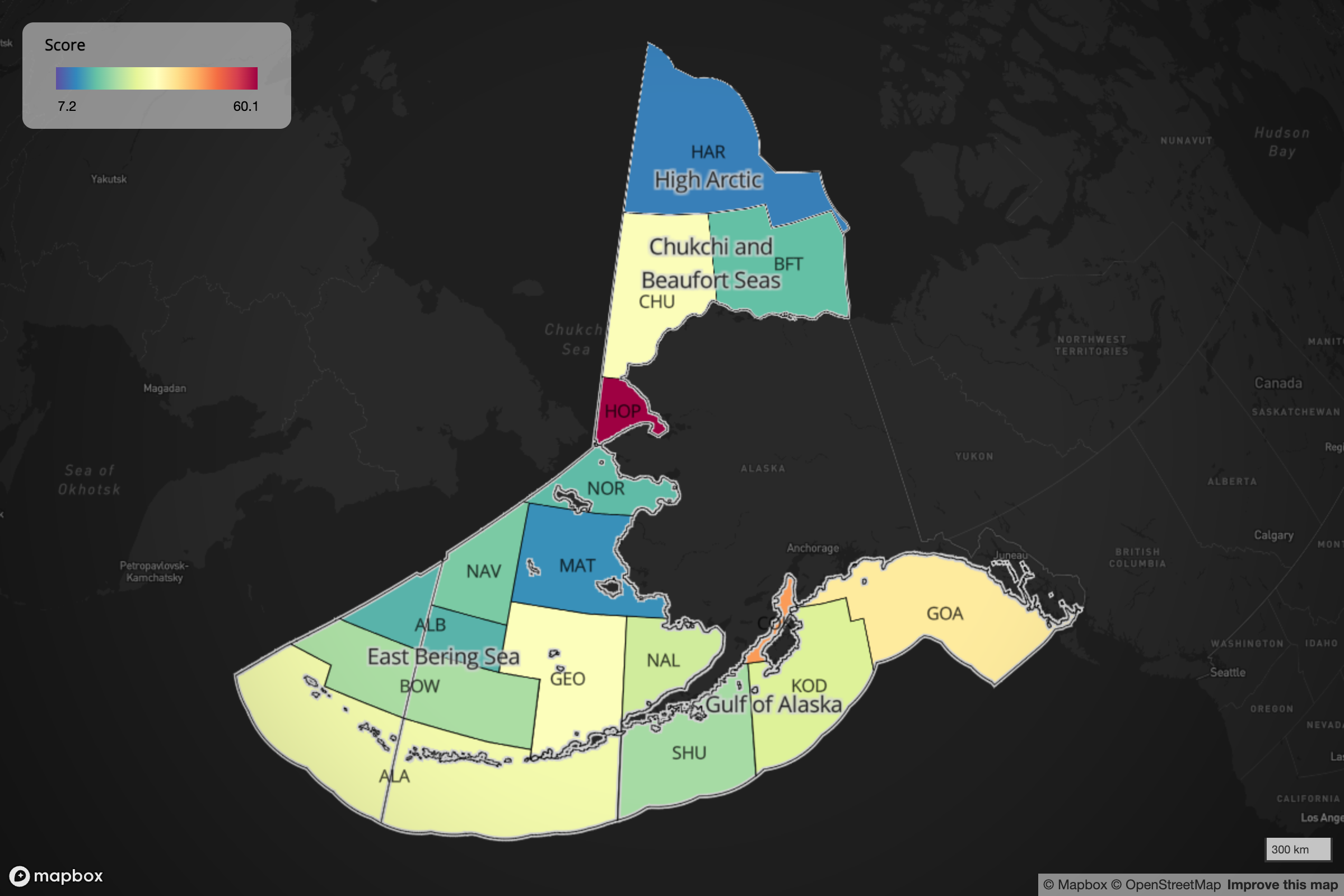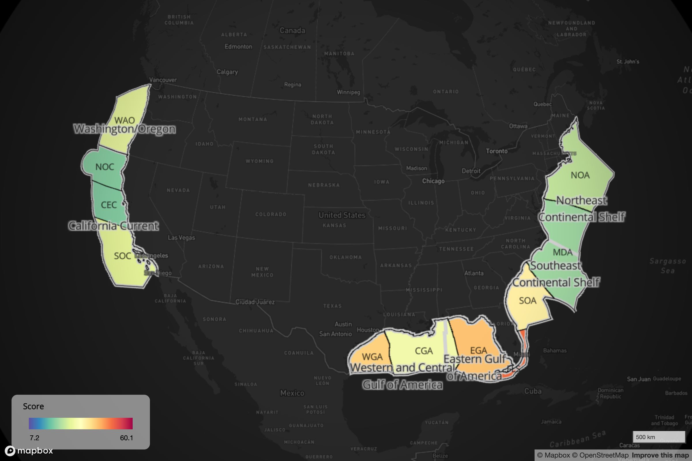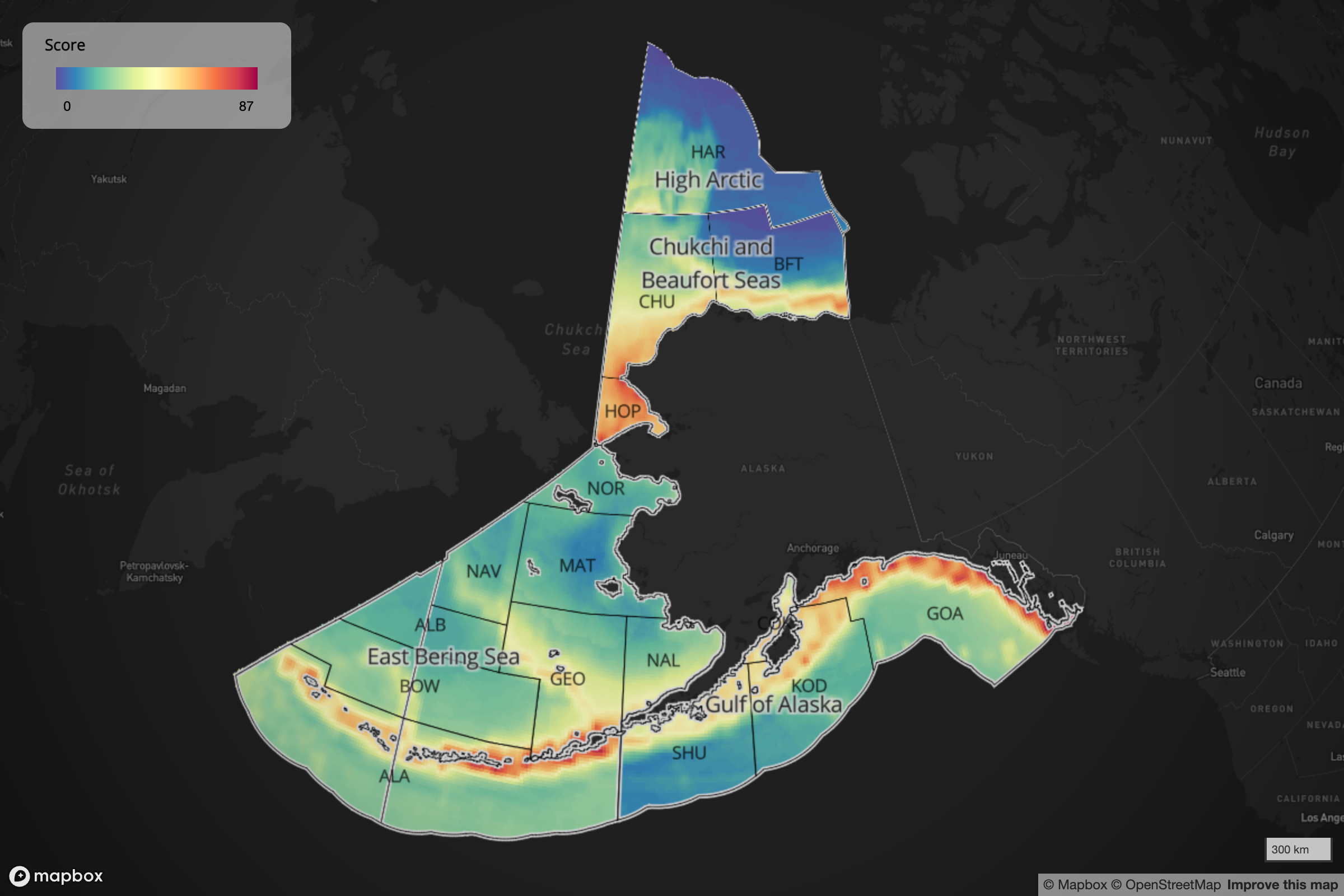 Scores from individual grid cells are aggregated to BOEM Planning Areas using area-weighted averages. To enable meaningful comparisons across ecologically diverse regions, sensitivity scores are rescaled within BOEM Ecoregions [0-100]. This ecoregional rescaling accounts for natural differences in species richness, productivity, and baseline extinction risk between Arctic, temperate, and tropical waters. Planning Area scores represent the area-weighted average of constituent cell scores, ensuring larger areas do not disproportionately influence regional sensitivity patterns.