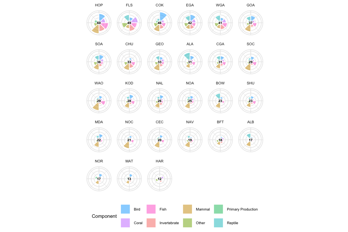 Visualization and Decision Support :The MST utilizes interactive visualizations, such as the Flower Plot, to convey complex vulnerability assessment results. This tool allows stakeholders and scientists to understand the underlying components contributing to an area’s vulnerability to offshore energy development. The length of each petal reflects the sensitivity score for a particular component or taxonomic group, while future iterations may use petal width to represent component weighting. By visualizing these component scores, the Flower Plot helps decision-makers quickly identify which ecological elements are driving vulnerability in a given location, supporting more informed spatial planning and impact assessment.